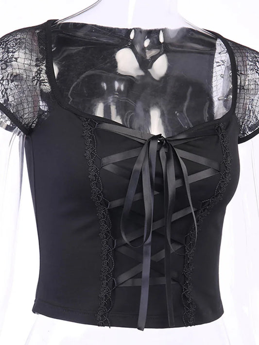 Vintage Tops Goth T-shirt Women Bodycon Bandage Lace Black T-shirts Gothic Streetwear Sexy Female Top Casual Mesh Tee