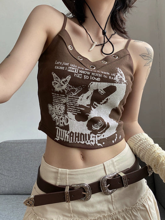 Top Women Y2k Devil's Eyes Retro Print Hanging Neck Suspender Vest Women's Summer Korean Fashion Slim And Slimming Short Top
