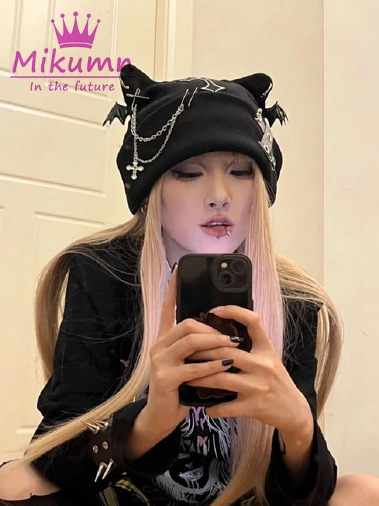 Mikumn Gothic Grunge Cat Ear Bat Wing Black Beanie Hat Harajuku Punk Cross Chain Knitted Hat Women Winter Warm Chic Streetwear